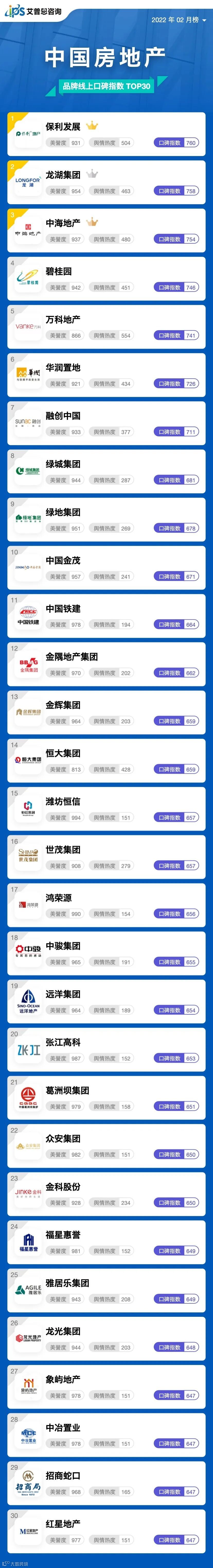 榜单|2022年02月中国房地产企业百度搜索SEO表现TOP30