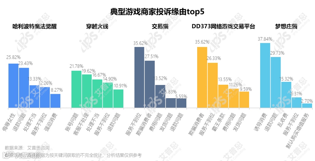 DD373被诉缘由中欺骗消费者排第一,主要表现为买到魔兽世界黑金,被系统收回,申请退款后不处理;梦想庄园被诉的诱导消费问题最多,主要表现为在儿童手表小天才应用中心以数学语文会员课程的形式诱导未成年消费。