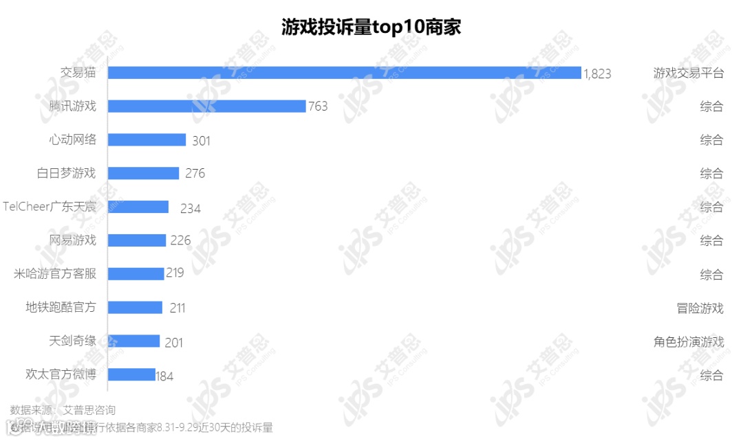 近30天投诉量最多的前十游戏商家中,交易猫的投诉量最高(1,823起);腾讯游戏(763起)和心动网络(301起)分别排行第二、第三;地铁跑酷(211起)8月因“不吃金币”新玩法翻红后,投诉量增加,排行第八;天剑奇缘(201起)因在快手直播间宣传“充值88元就能获得300元红包”涉嫌诱导消费,投诉量排行第九。
