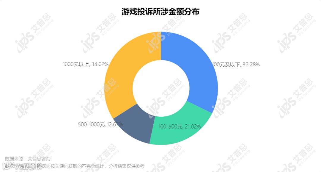 网络游戏相关投诉中,涉诉金额在1000元以上的投诉量占比34.02%,其次是金额在100元以下的投诉量,占比32.28%。