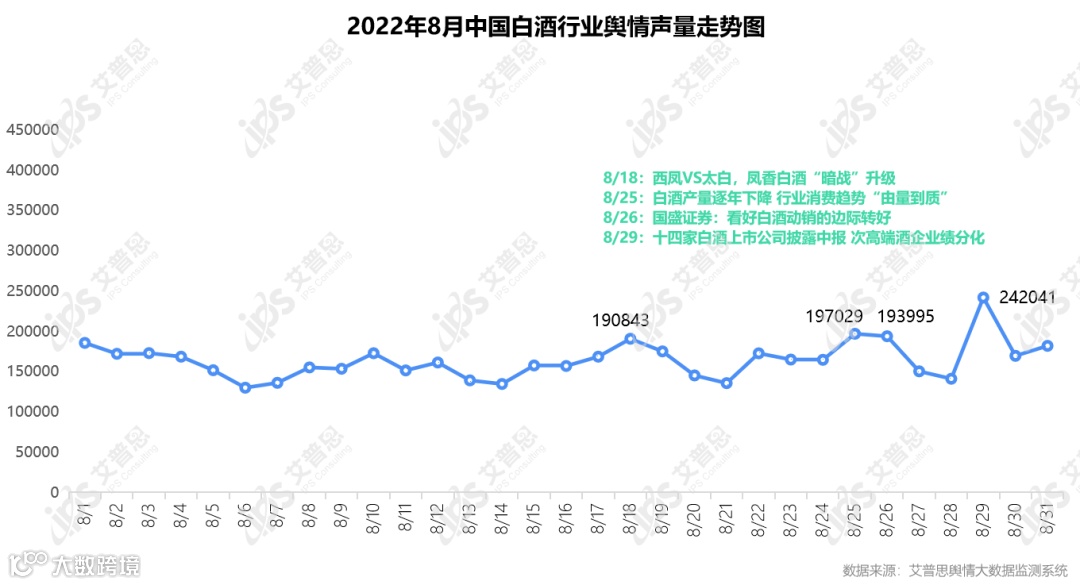 艾普思舆情大数据监测系统显示,8月,涉及白酒行业的舆情声量为5,095,721篇次,日均声量达164,378 篇次。其中,声量极值出现在8月29日(单日声量242,041篇次),主要受《十四家白酒上市公司披露中报,次高端酒企业绩分化》《国家地理标志产品新名单涉酒》等报道影响。