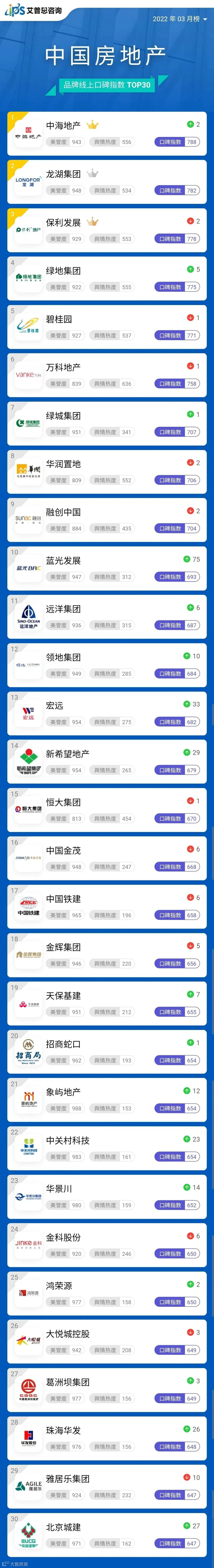榜单|2022年03月中国房地产企业百度搜索SEO表现TOP30