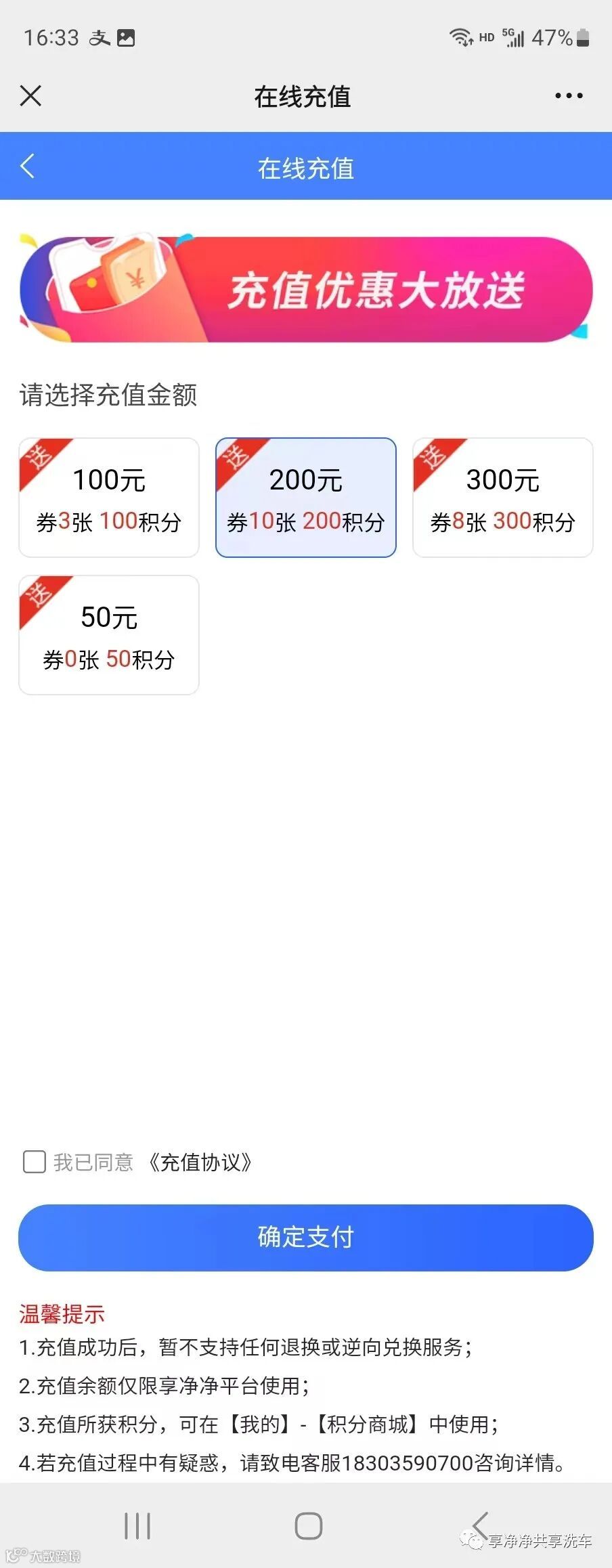 充值200送100等于10张洗车券,每张洗车券价值10元,可以洗一次车。