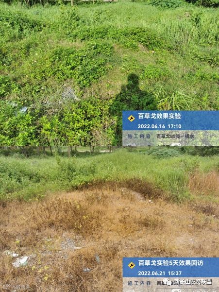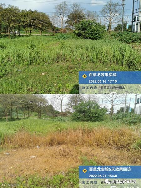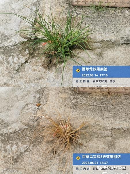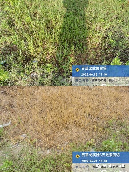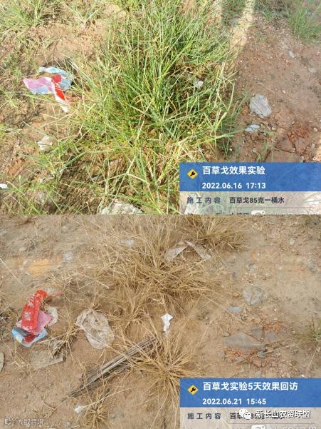 通过观察可发现,用药5天后,牛筋草、茅草、狗牙根等恶性杂草,全部发黄干枯,死草明显。说明百草戈®