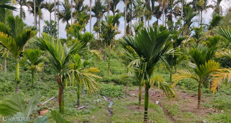 3、定植后3年为槟榔幼龄期,需要给槟榔树荫蔽保湿,可以在槟榔树周围种植灌木药材等,但是要增施肥料,保证槟榔树能茁壮成长。