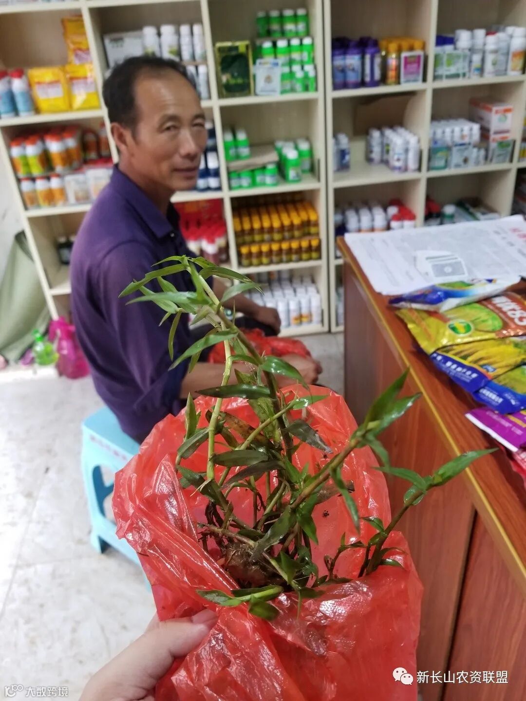 一对夫妇带着一袋杂草,来到客户店里,向客户询问这是什么草,用什么药剂防治。