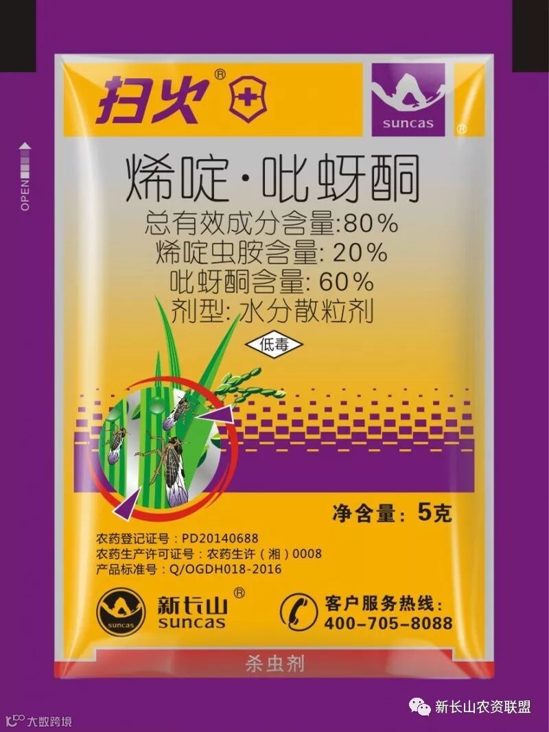 (4)中晚稻及再生稻叶片嫩绿食料丰富,稻飞虱、稻纵卷叶螟为害提供了极有利的条件。防治药剂推荐:新长山扫火15g/亩、长山超戈12g/亩、春隆150ml/亩。