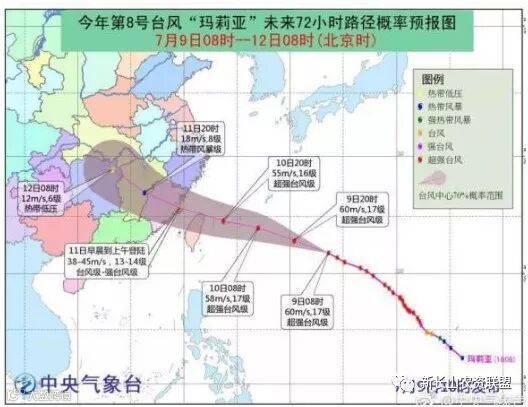 中国中央气象台9日消息,“玛利亚”将于11日上午在福建晋江到福鼎沿海一带登陆。届时“玛莉亚”会以最大风力17级(60米/秒),920百帕,七级风圈半径340-550公里,十级风圈半径120-180公里,十二级风圈半径60-70公里的影响力强行登陆,且福建、浙江沿海一地、江西、湖南东北部、湖北东南部将受到程度不同的影响。