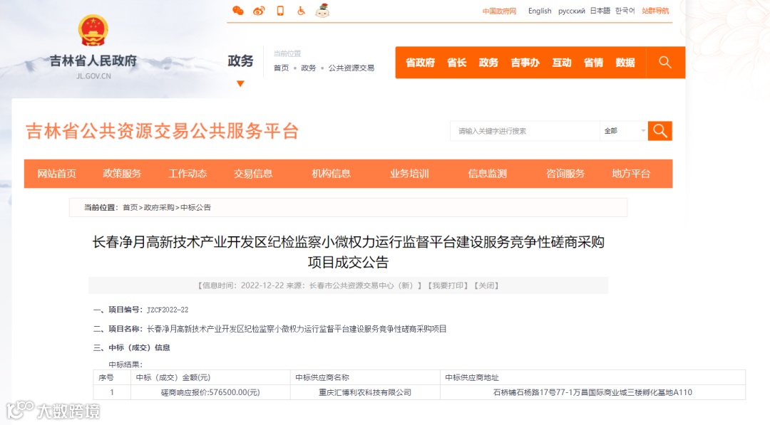 2022年12月22日,长春净月高新技术产业开发区纪检监察小微权力运行监督平台建设服务竞争性磋商采购项目成交结果公告,公告显示重庆汇博利农科技成功中标纪检监察小微权力运行监督平台建设服务,证明了重庆汇博利农科技在“互联网+小微权力监督”领域的创新能力和价值。