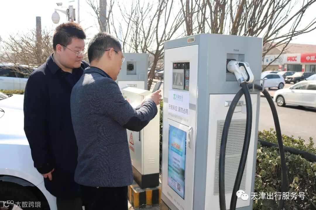 参观完公司之后,一行人乘坐着“天津出行”新能源汽车,来到公司建设的充电桩场地进行视察,公司副总裁周春辉向各位领导讲解并展示了如何使用充电桩。