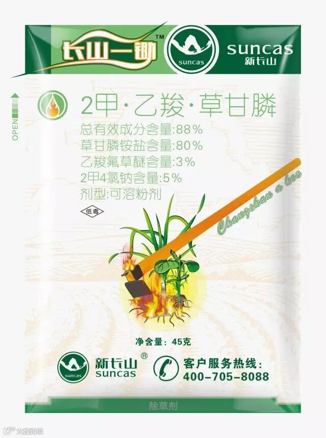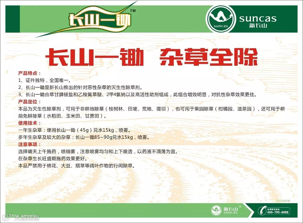 新长山农学家“长山一锄”是湖南新长山公司推出的重磅灭生性除草剂,由草甘膦铵盐、乙羧氟草醚、二甲四氯以及高活性助剂组成,三元复配,强强联合,效果更佳。