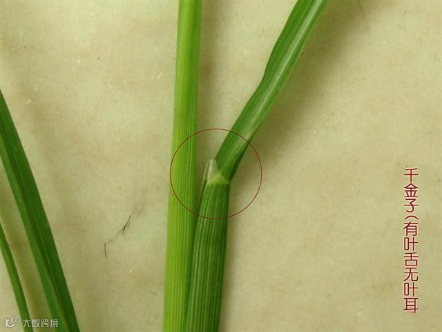 二、千金,有叶舌无叶耳。。(注意一下,叶舌比水稻的叶舌短一些。没有毛茸茸的的叶耳)