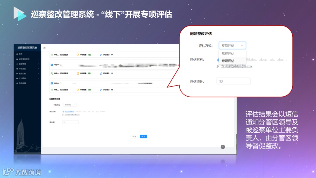 所有评估结果录入系统后,系统会短信通知分管区领导及被巡察单位主要负责人,由分管区领导督促整改。对评估结果为一二类(95分以上的为一类,90-95分为二类)的,发出《督办通知书》,对三类(90分以下为三类)的发出《重改通知书》,要求限期重新整改,直到全部问题整改完成。