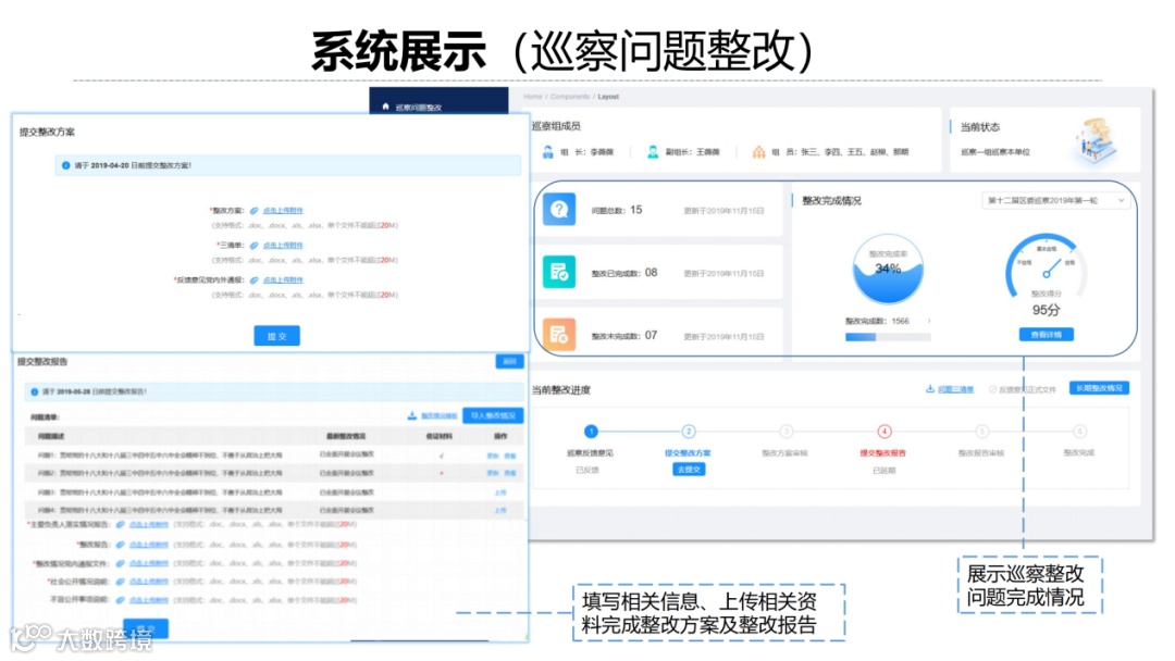 系统也可按照不同级别、不同角色的业务流程,进行分级管理。如为巡察办、巡察组、巡察对象、纪委/组织部、区委整改办开发不同的用户界面,简化功能菜单,使巡视巡察工作更加方便快捷。