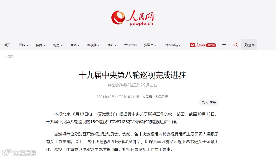 近日,据人民日报报道,根据党中央关于巡视工作的统一部署,截至10月12日,十九届中央第八轮巡视的15个巡视组完成对25家金融单位的巡视进驻工作。