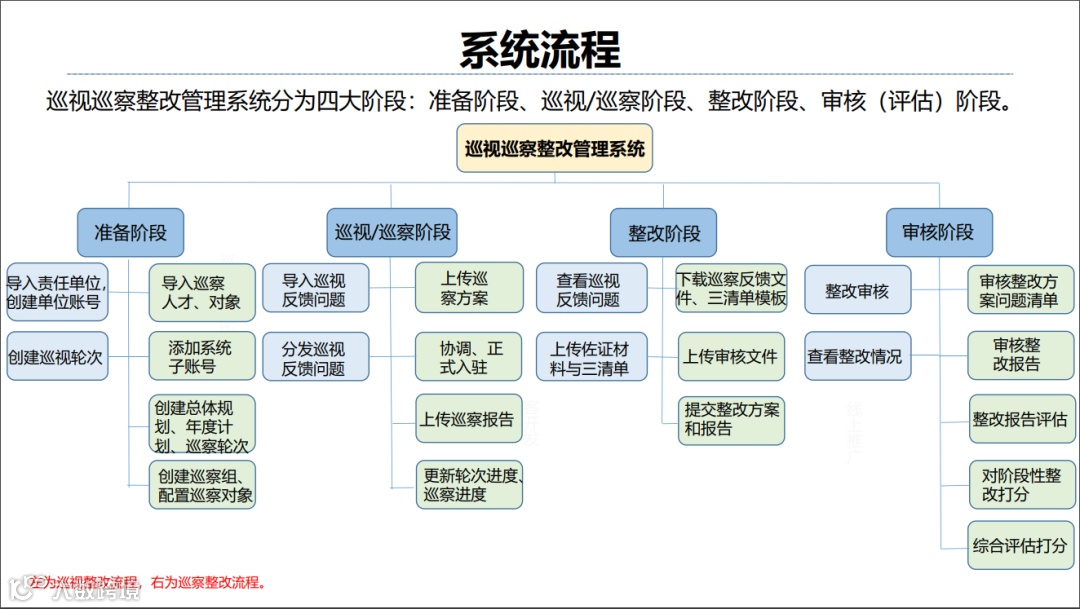 巡视巡察整改管理系统主要分为四大阶段:准备阶段、巡视/巡察阶段、整改阶段、审核(评估)阶段。