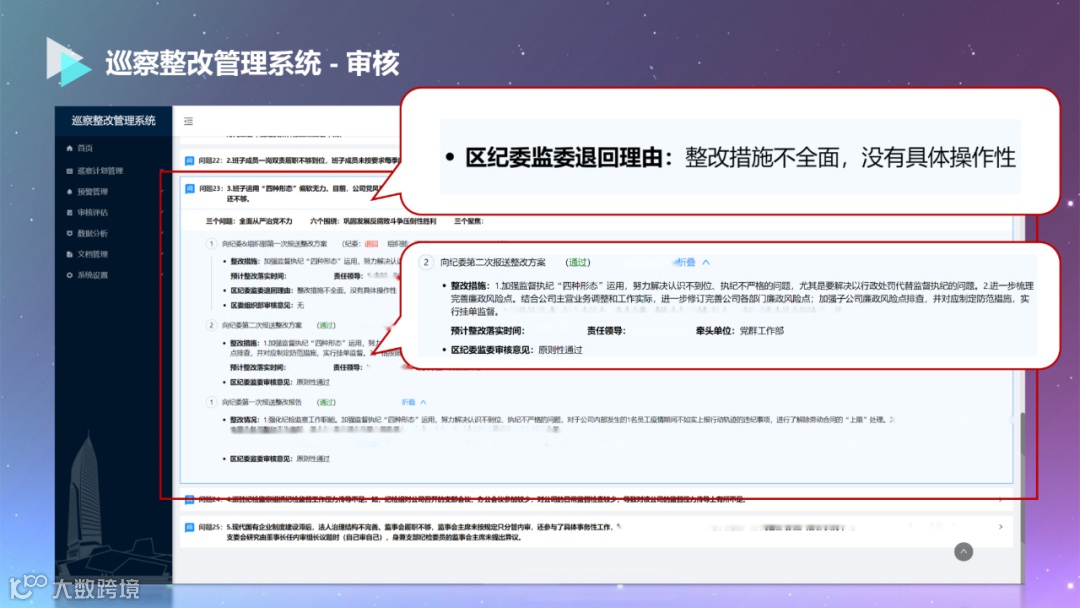在被巡察单位线上提交了整改方案、整改报告、“三清单”(问题、责任、措施清单)及佐证资料后,区纪委和区委组织部审核人需要对照问题清单逐项审查整改情况,查看佐证资料,提出审核意见,对不合格的予以退回。退回时,系统会向被巡察单位主要负责人发送警示信息,责令限时重新报送,直到审核通过。