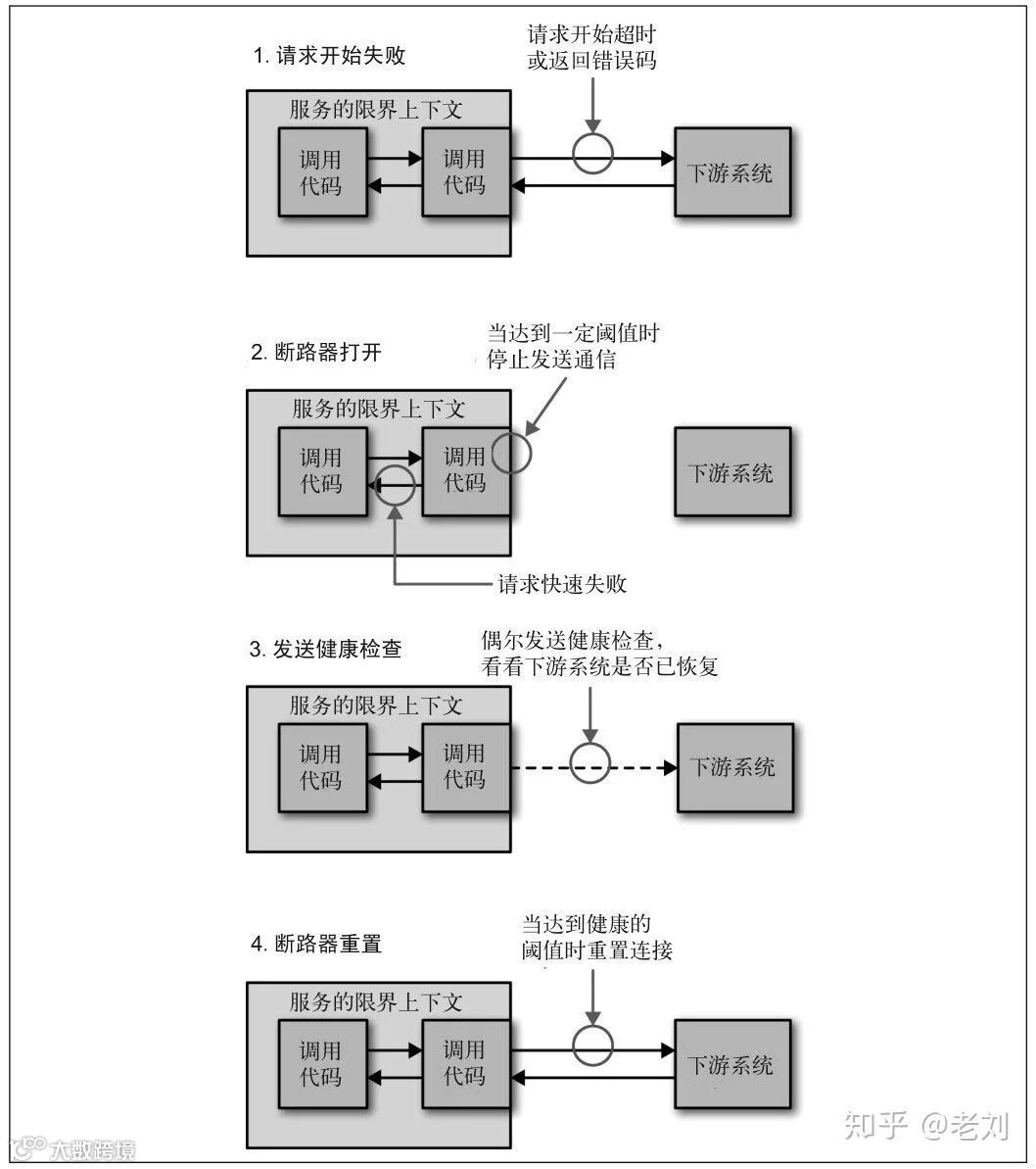 当一个服务因为各种原因停止响应时,调用方通常会等待一段时间,然后超时或者收到错误返回。如果调用链路比较长,可能会导致请求堆积,整条链路占用大量资源一直在等待下游响应。所以当多次访问一个服务失败时,应熔断,标记该服务已停止工作,直接返回错误。直至该服务恢复正常后再重新建立连接。