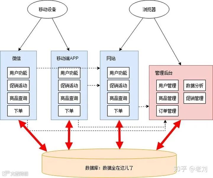 因为开发任务比较紧迫,小明小红没有好好规划整个系统的架构,随便拍了拍脑袋,决定把促销管理和数据分析放在管理后台里,微信和移动端APP另外搭建。通宵了几天后,新功能和新应用基本完工。这时架构图如下: