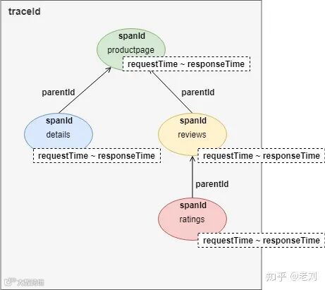 从图中可以看到,这是一个用户访问productpage页面的请求。在请求过程中,productpage服务顺序调用了details和reviews服务的接口。而reviews服务在响应过程中又调用了ratings的接口。整个链路跟踪的记录是一棵树: