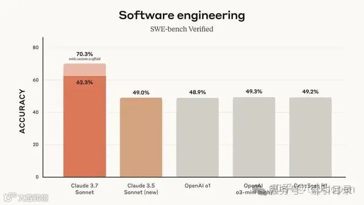 编码一直是 Claude 的专长;他们甚至专门用编码标记来训练模型,让它们成为开发人员的宠儿。这是 SWE-Bench 上的 Claude。