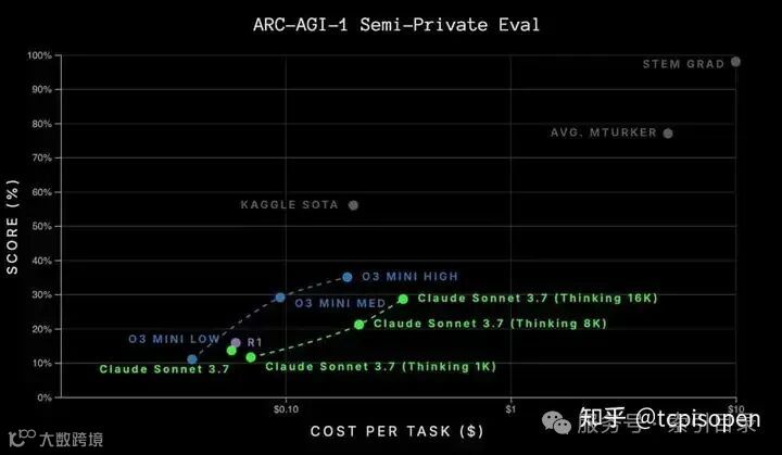 从 ARC-AGI 基准测试来看,Claude 的 3.7 Sonnet 具有思考功能,在 16k 上下文中得分与 o3-mini-high 相当。r1 与基本 Sonnet 模型相比。Anthropic 确实做得很好。