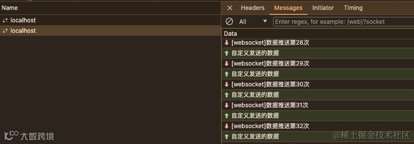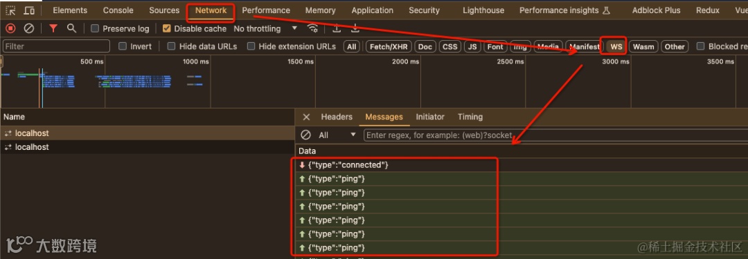 等待一段时间后,我们可以看到ws连接里,前端已经发送了多次心跳数据