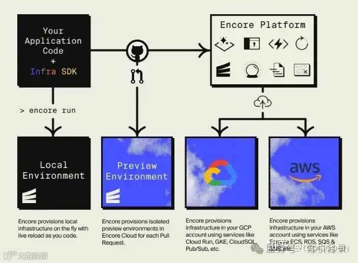 Encore Cloud 可自动在所有环境和所有主要云提供商中配置所有必要的基础设施,而无需更改应用程序代码。