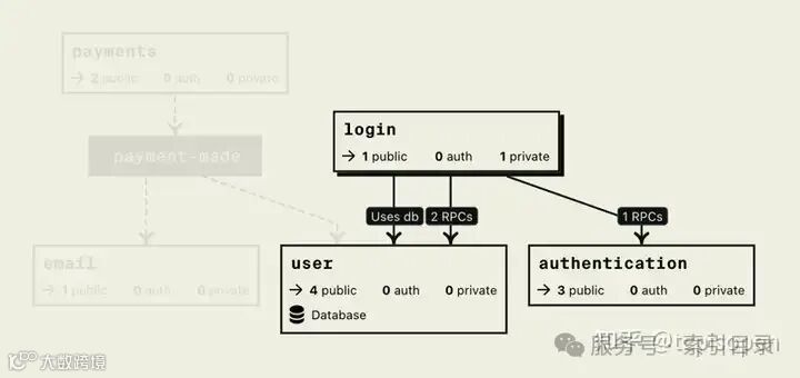 从下图中,我们可以注意到,它对 login 数据库进行查询并向服务的两个端点发出请求, user 同时向 authentication 服务的一个端点发出请求。