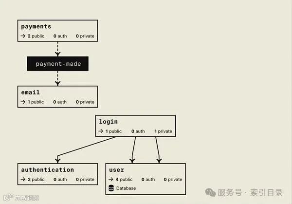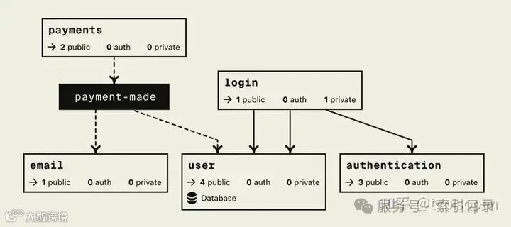 在下面的示例中, login 服务依赖于 user 和 authentication 服务。虚线箭头表示发布或订阅某个主题。此处, payment 发布到该 payment-made 主题并 email 订阅该主题。