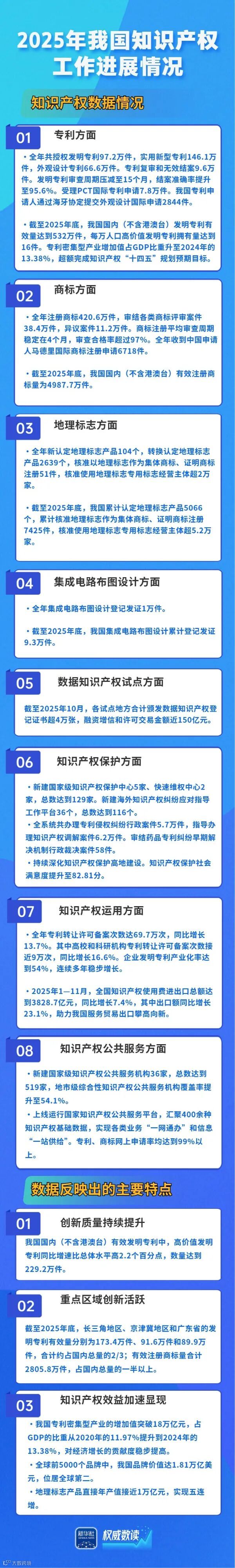 发明专利有效量达532万件,人工智能专利有效量居全球前列,地理标志产品直接年产值实现五连增……在23日国新办新闻发布会上,国家知识产权局介绍2025年我国知识产权工作进展情况。