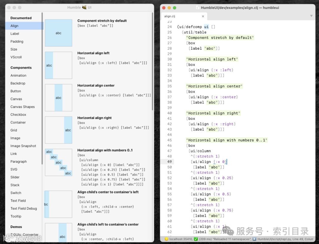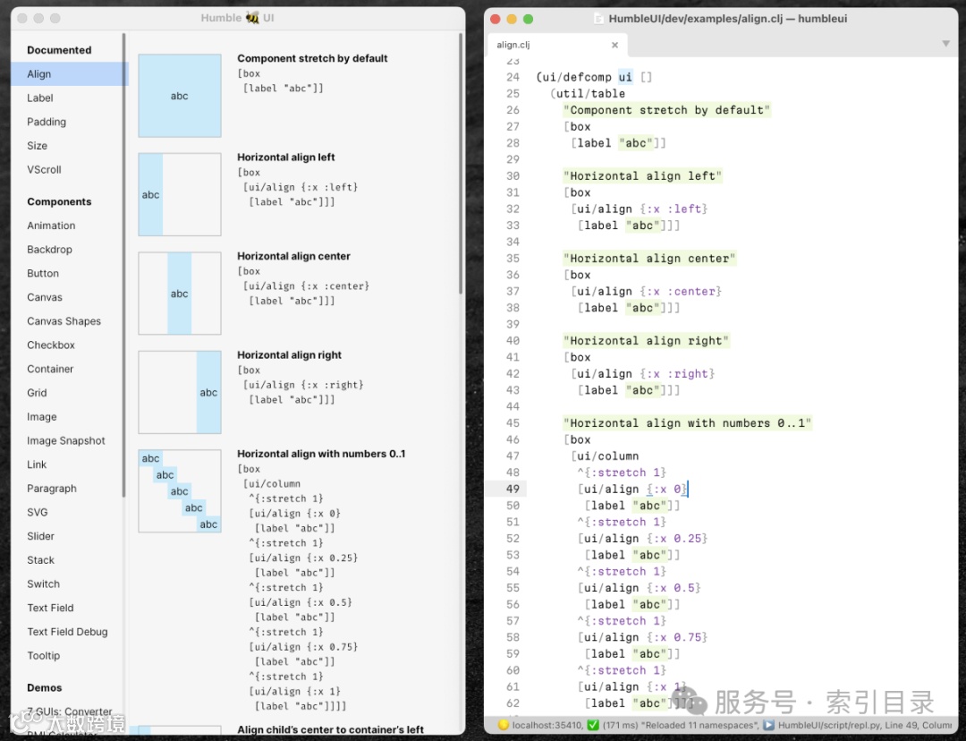 实现这个功能的方式其实很简单:通过 Clojure 的宏来解析代码并生成 UI。我们可以编写一个宏,接收一组组件示例,并生成一个 UI 表格,每一行显示左边是代码,右边是渲染的结果。这就是我实现的第一个宏: