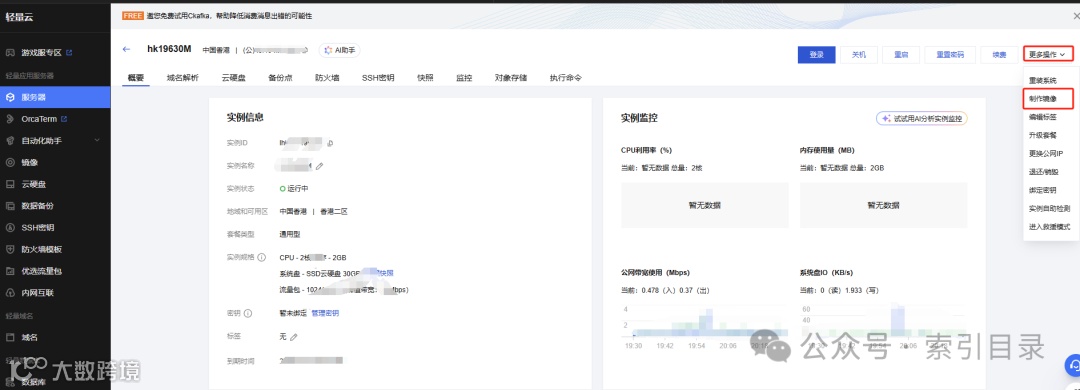 在服务器详情页面,点击右上角的“更多操作”按钮,在下拉菜单中选择“制作镜像”。