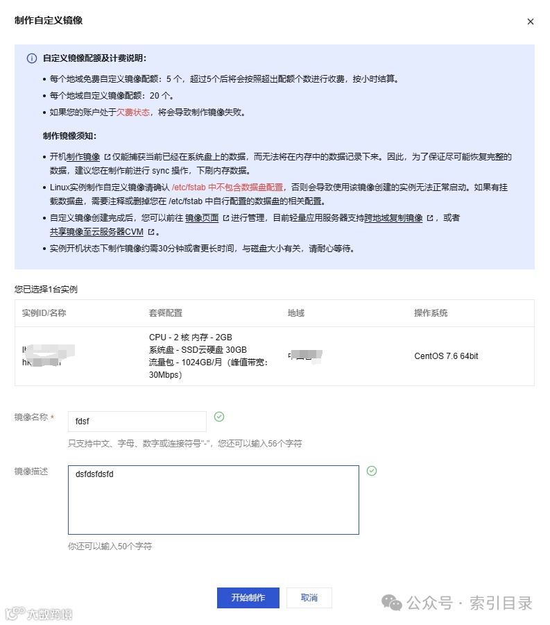 在弹出的“制作镜像”窗口中,填写镜像名称和描述。镜像名称可以根据实际情况进行命名,描述则可以帮助自己和团队成员理解镜像的用途或特点。填写完毕后,点击“开始制作”按钮。