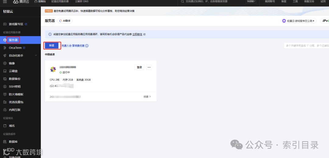 在腾讯云控制台中,进入“服务器”页面,点击右上角的“新建”按钮。