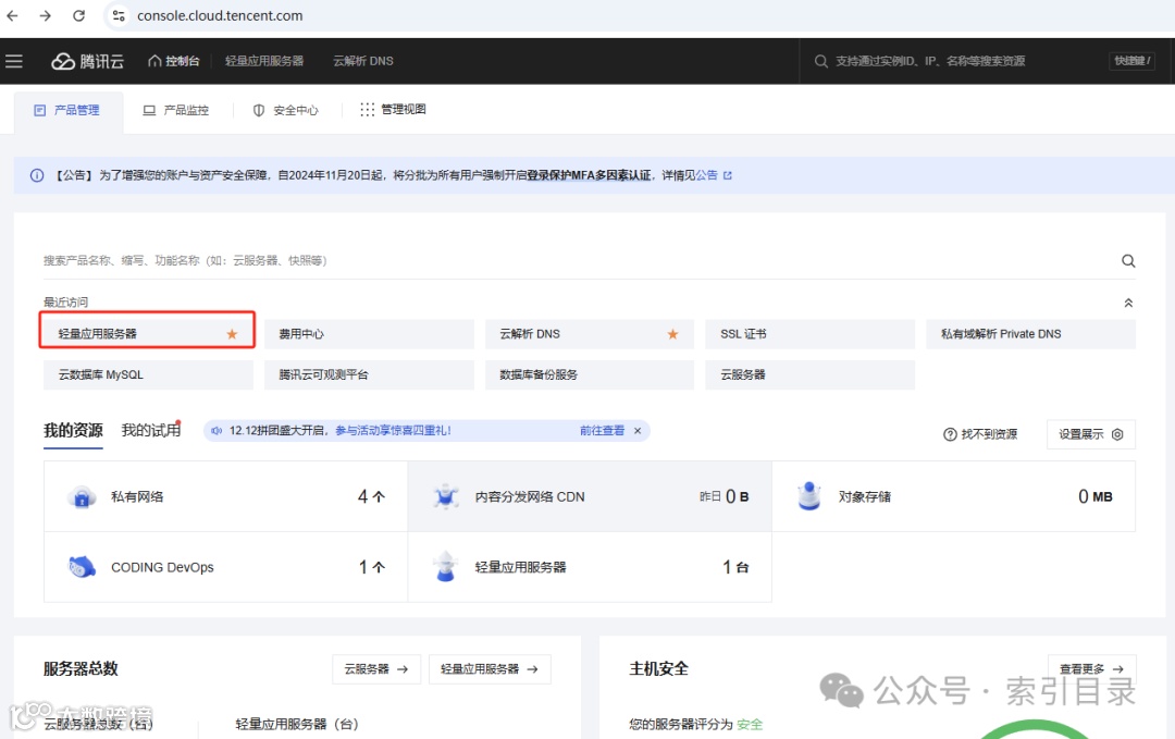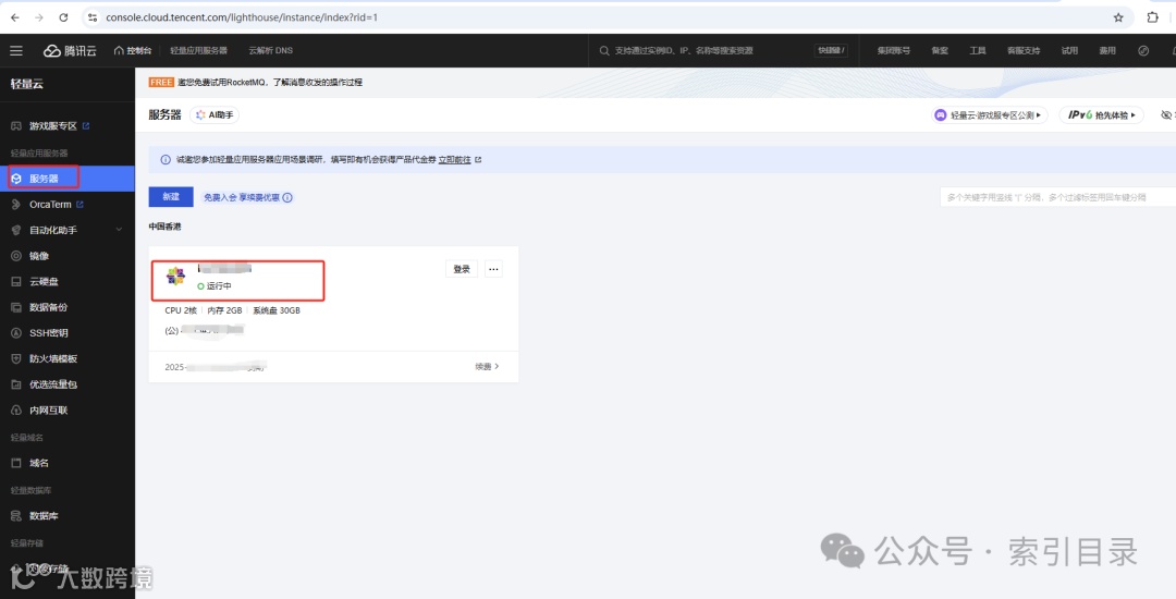 首先,用户需要登录到腾讯云控制台(https://console.cloud.tencent.com)。登录后,在左侧导航栏中找到“轻量应用服务器”并点击进入。