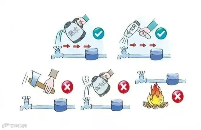 如发现家中水管、龙头冻住,可用电吹风烘吹,或用毛巾包裹后慢慢用温水浇淋。切不可用火直接烘烤或用开水急烫,以免造成管道或者水表爆裂。