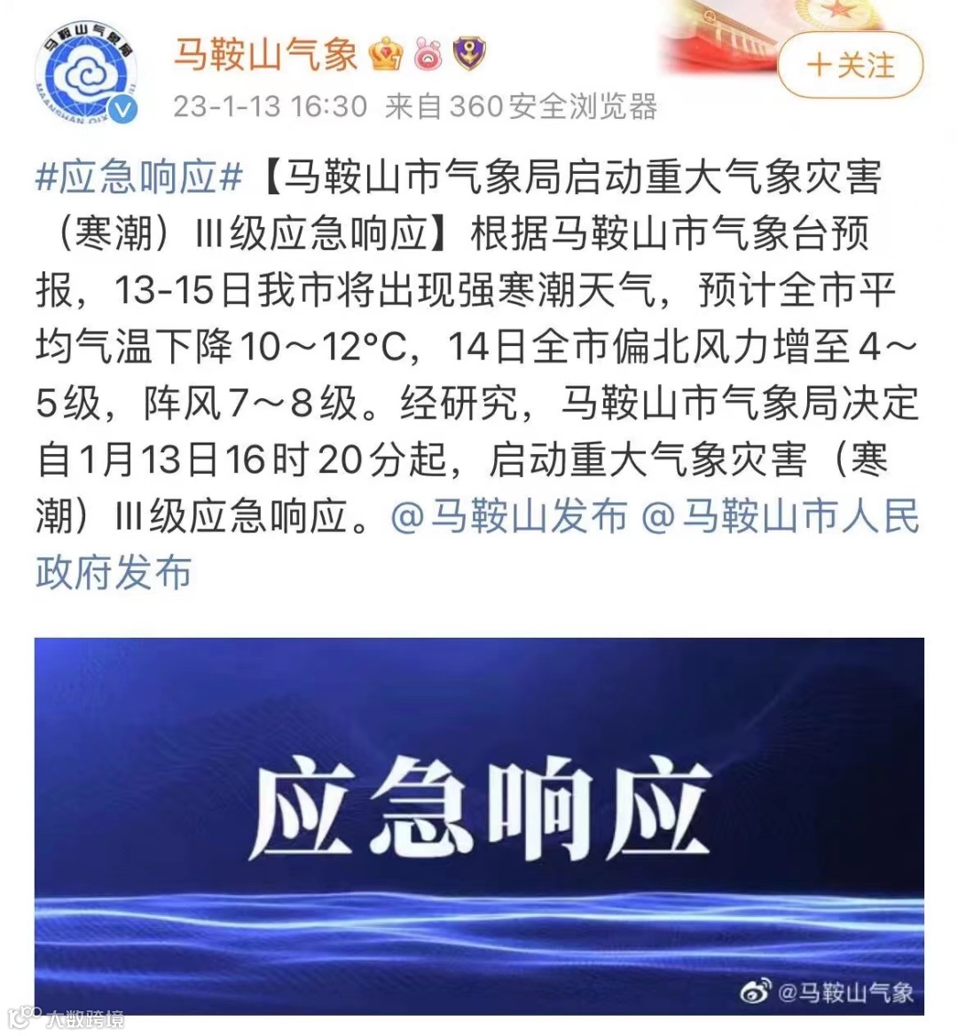 根据市气象台预报,13-15日我市将出现强寒潮天气,预计全市平均气温下降10~12℃,自1月13日16时20分起,市气象局启动重大气象灾害(寒潮)Ⅲ级应急响应。