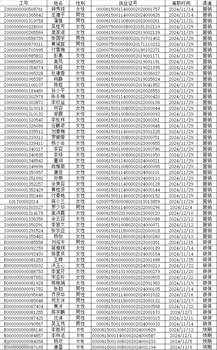 本次公示离职人员包含营销渠道40人,银保渠道15人,续期渠道4人,共计59人。公示的信息包含离职人员工号,姓名、性别、执业证号码以及离职时间。
