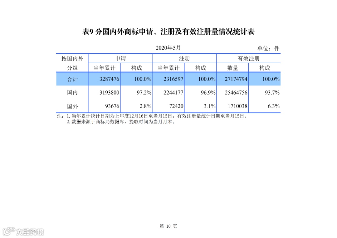 2020 年 1-5 月,我国商标申请量为 328.7 万件,商标注册量为 231.7 万件。截至 2020 年 5 月底,有效注册商标量2717.5 万件。