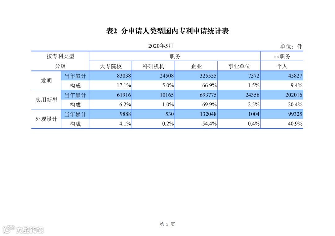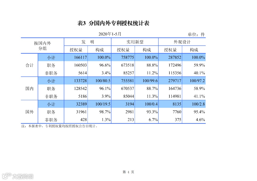 据国家知识产权局发布2020年1--5月知识产权主要统计数据显示:2020 年 1-5 月,我国发明专利申请 55.0 万件,发明专利授权 16.6 万件;实用新型专利申请 99.6 万件,实用新型专利授权 75.9 万件;外观设计专利申请 25.0 万件,外观设计专利授权 28.8 万件;受理 PCT 国际专利申请 2.36 万件;受理复审请求 2.16 万件。商标申请量为 328.7 万件;核准使用地理标志产品专用标志企业 306 家;集成电路布图设计登记申请 4101件。