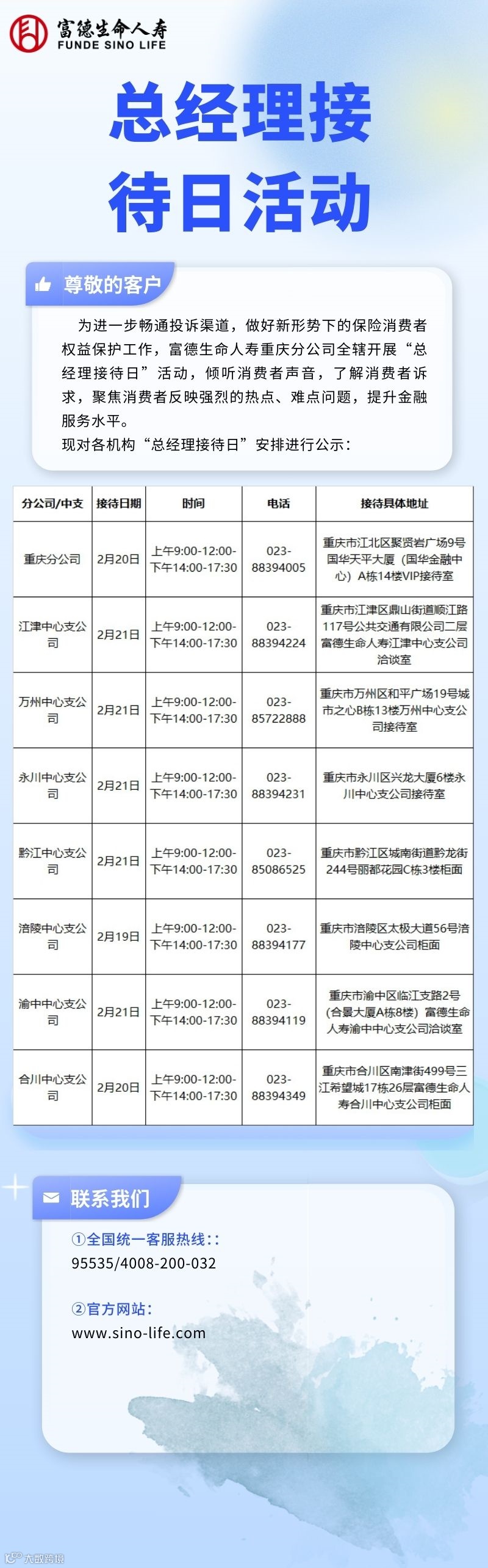 富德生命人寿重庆分公司2月总经理接待日活动安排