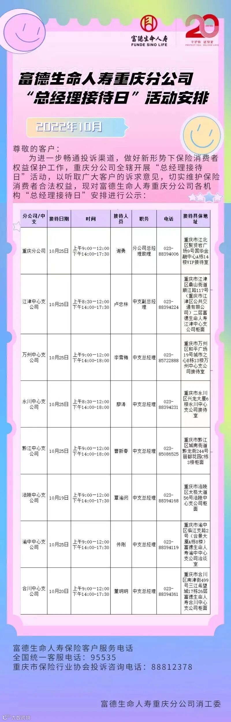 富德生命人寿重庆分公司10月“总经理接待日”活动安排