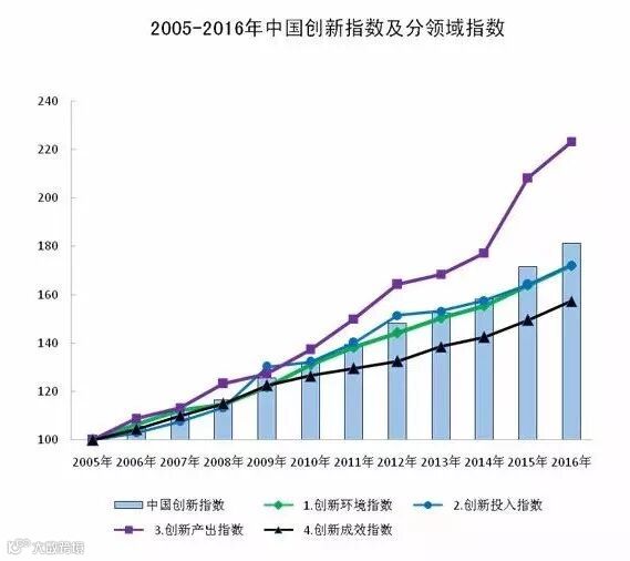 据国家统计局社科文司《中国创新指数研究》课题组测算,2016年中国创新指数为181.2(以2005年为100),比上年增长5.7%。分领域看,创新环境指数、创新投入指数、创新产出指数和创新成效指数分别达到172.0、172.2、223.3和157.3,分别比上年增长4.9%、4.8%、7.2%和5.2%。测算结果表明,2016年我国创新环境继续优化,创新投入力度加大,创新产出能力稳步提升,创新成效进一步显现,创新型国家建设持续推进。