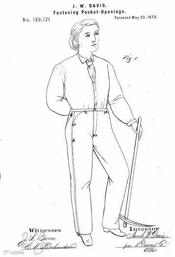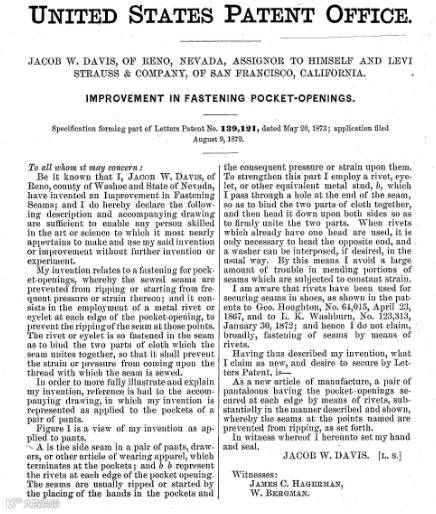 美国内达华州里诺(Reno)的裁缝Jacob Davis是Levi Strauss的老顾客。在1872年,他写了一封信给李维斯,表示自己想出了一种制作工装裤的方法,在口袋边角和裤档开口钮扣处这些受力点位置采用金属铆钉进行加固,这样能使裤子更加结实耐穿。但是Jacob Davis没有钱来申请专利(那时需要68美元),于是他建议李维斯提供赞助,两个人共同获得专利,给Levi Strauss的回报是将来该裤装所产生利润的一半。Levi Strauss欣然同意,于是就这样,“加固口袋开口的改进方法”的专利在1873年5月20日共同授予给了这两人,而正是通过这个专利,制造了我们现在所熟知的牛仔裤。(下图即为从美国专利局查到的1873年授权的该专利及其附图)