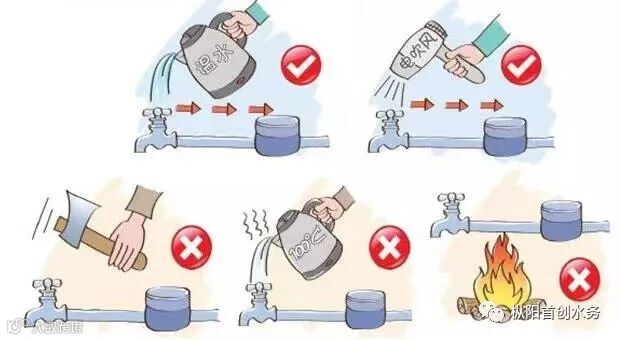 在冻住不能用水时,不要用火烘烤或用开水烫水管、水表和水龙头等,可用电吹风烘吹,或用热毛巾包裹后慢慢用50度左右的温水浇淋,一般即可解冻,或等气温升高后,用水也可自动恢复正常。