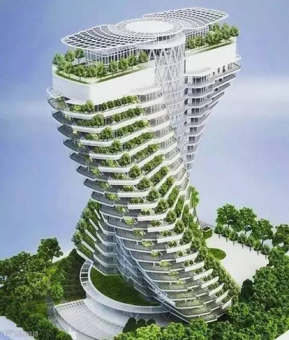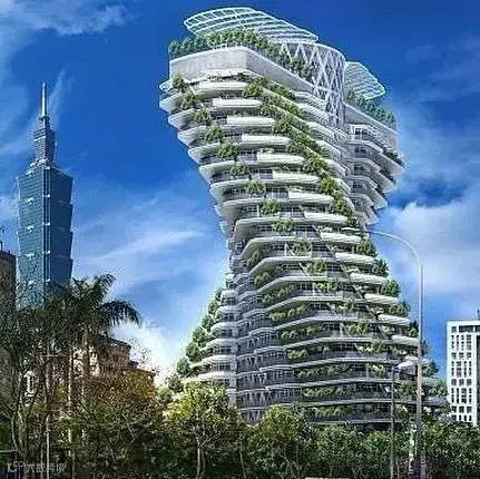 中国台北有一座扭曲盘旋的绿色建筑 Agora Tower,既像两只交叉在一起双手,又神似DNA的螺旋结构。花园上种有可食用的以及装饰性的植物,这里40户居住在豪华居所中的人们可以享用到他们大量自己种植的果蔬。