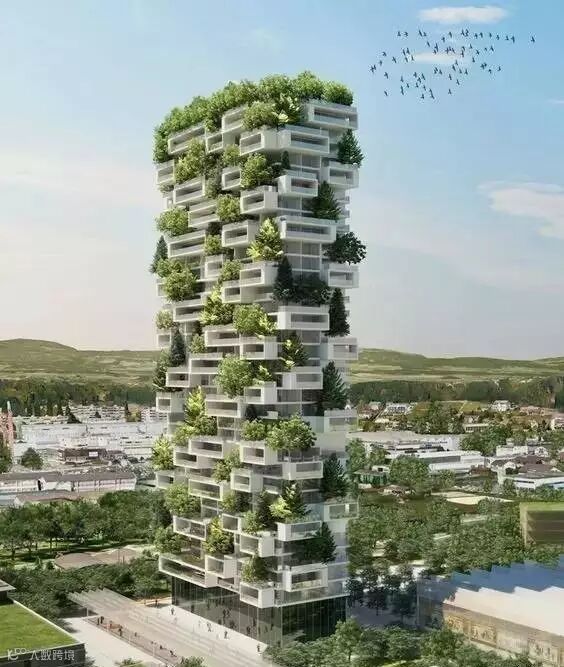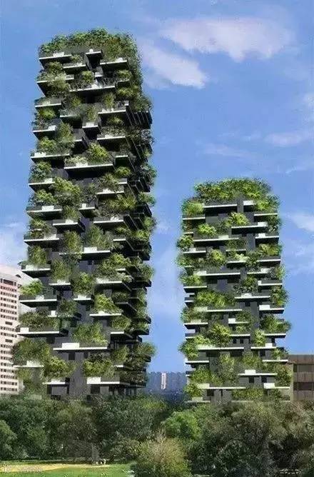 意大利米兰建了两座摩天"树塔",大楼外墙90%的面积被绿色植物包围,层层种下共730棵乔木、5000株灌木和1.1万株草本植物,远观楼群如同一片茂密森林,因此被称为“垂直森林”。
