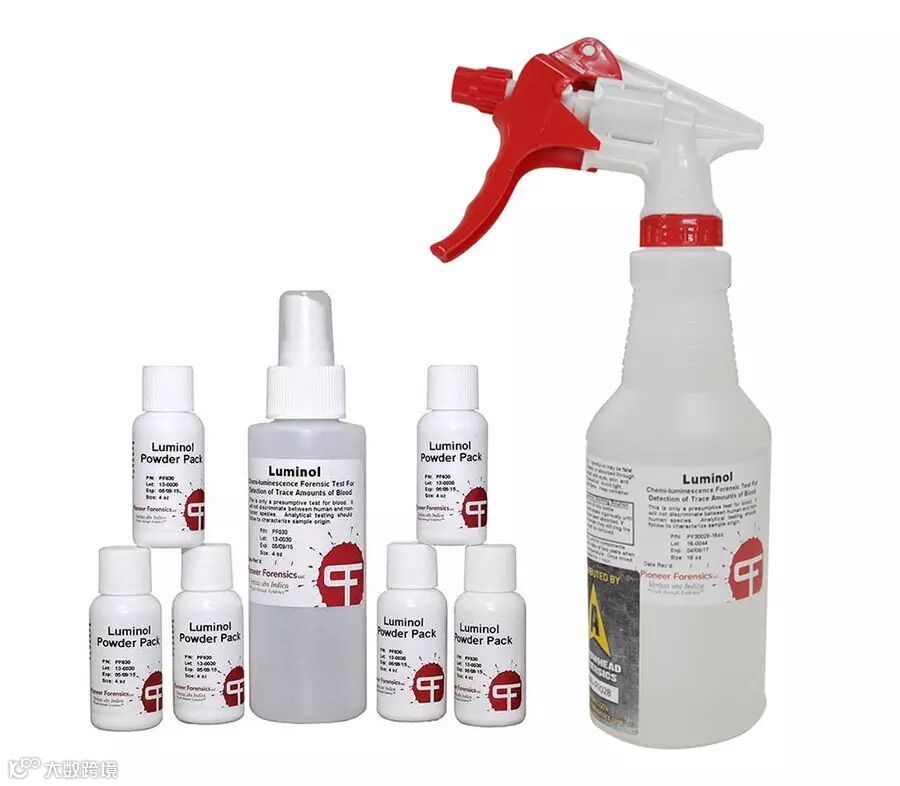 在国际有关专业机构的推荐和帮助下,弘德商城推出鲁米诺现场血痕发现试剂套装(产品编号:H80004 / H80005)。该产品由美国Pioneer Forensics公司生产,使用方便快捷,性能稳定,具有国际先进技术水平,广泛在国外案件现场血痕勘验中使用,国外案件现场血痕勘验中使用普及度较高。