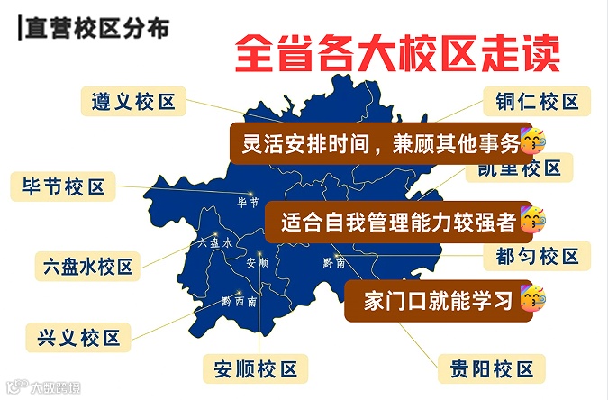 我们在贵州全省九大地区设有直营校区,无论你在哪个城市,都能找到离你最近的学习点:
